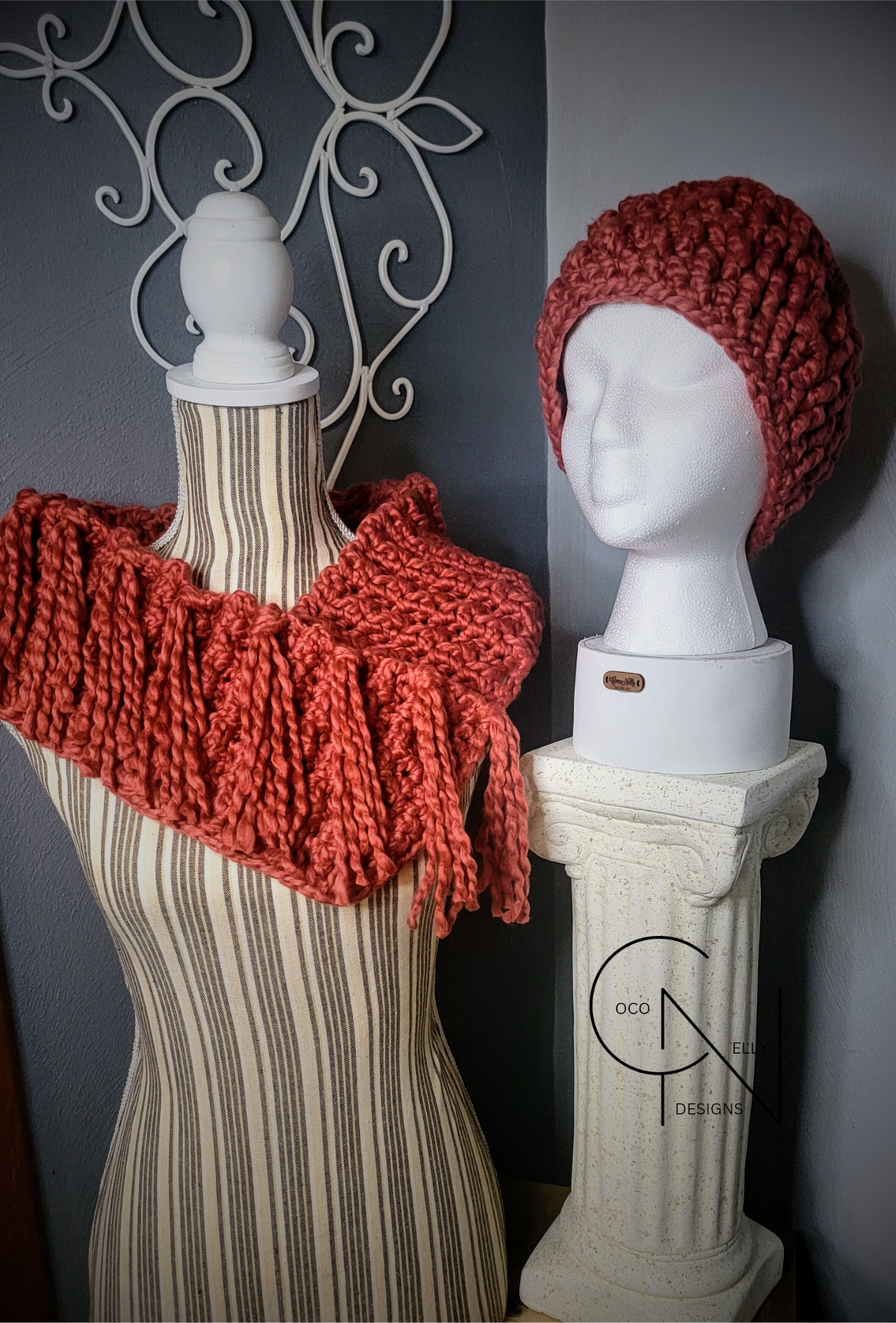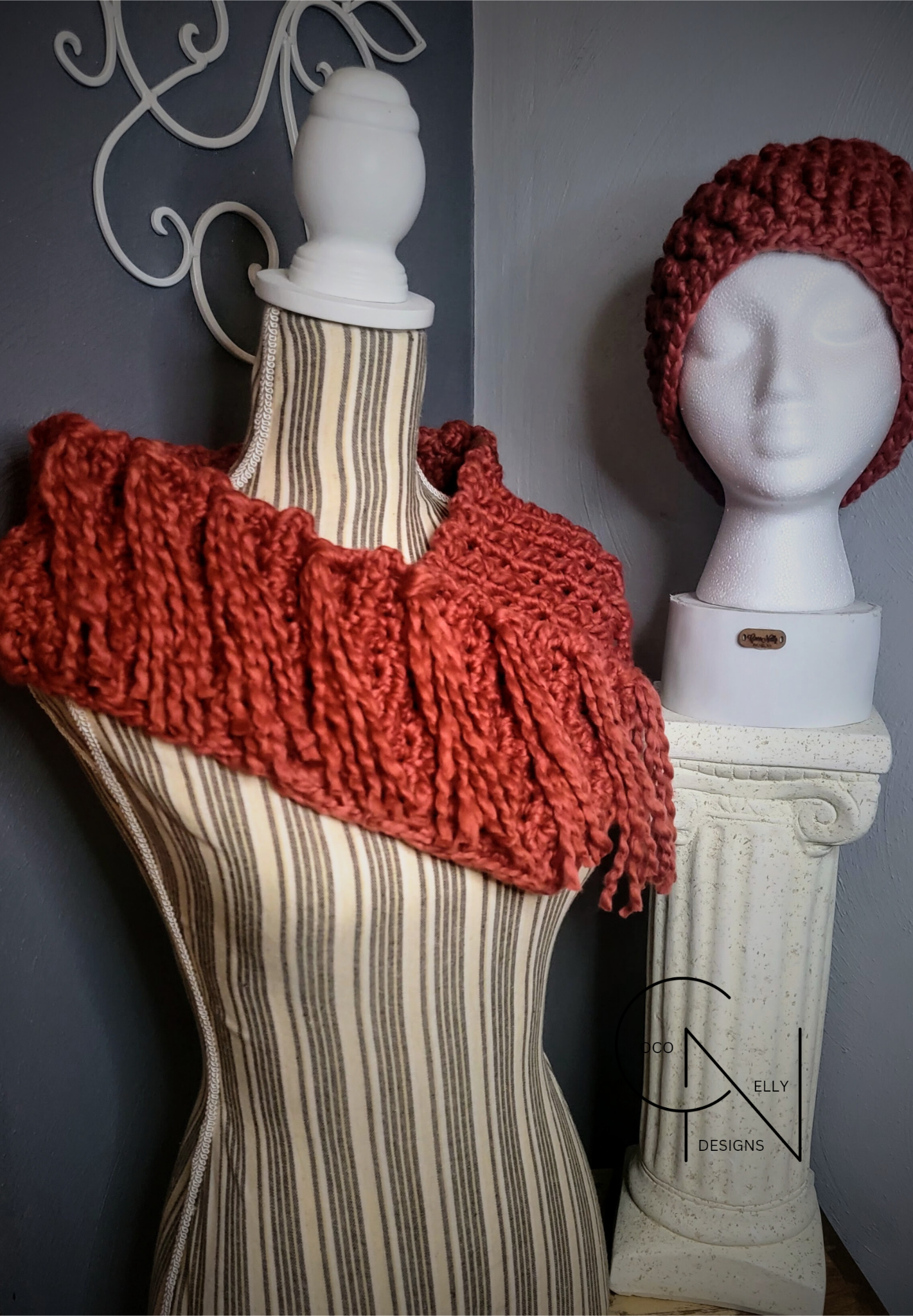 Clay Cowl/Headband is a hand-crocheted cowl and headband with a thick, chunky design that makes a perfect way to stay warm in the winter months. Its soft texture and beautiful styling make this cowl and headband a great accessory for creating a captivating, stylish look. The fringe detailing add unique elements to the piece.