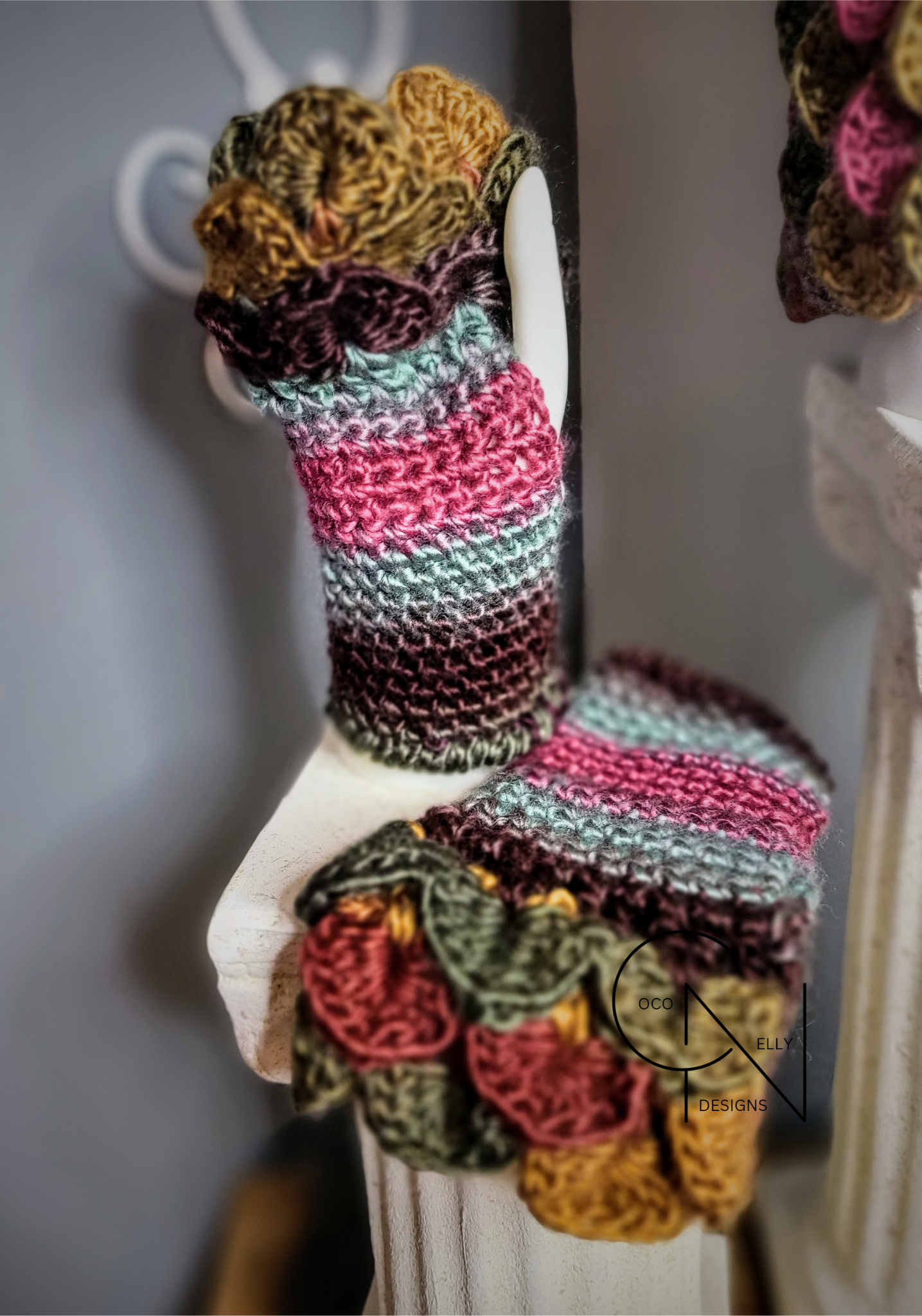 This exquisite set includes a one-of-a-kind, thick, hand-made winter hat and fingerless gloves crafted with beautiful, soft crochet. Perfectly designed to keep you warm in the coldest of days, the ensemble's unique oversized hat and its intricate desert-inspired colors add a touch of effortless elegance to any ensemble.