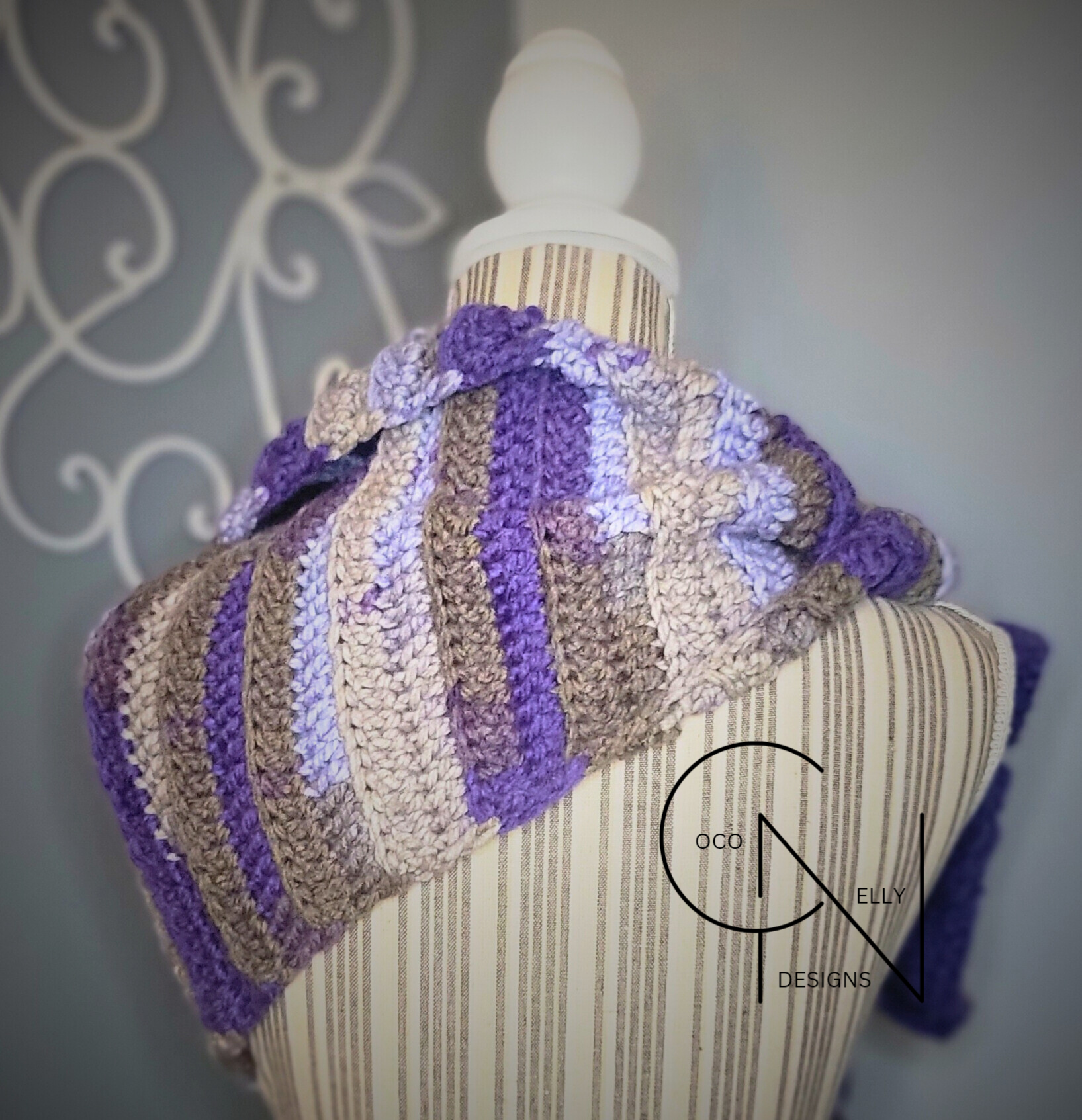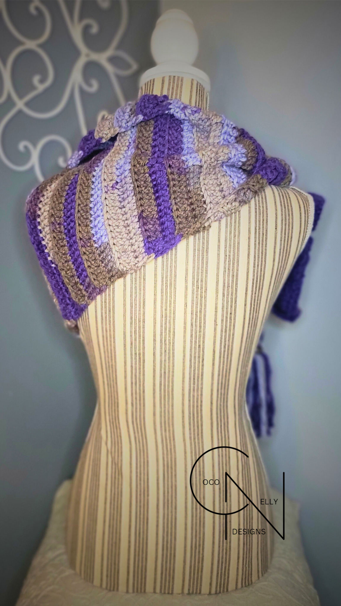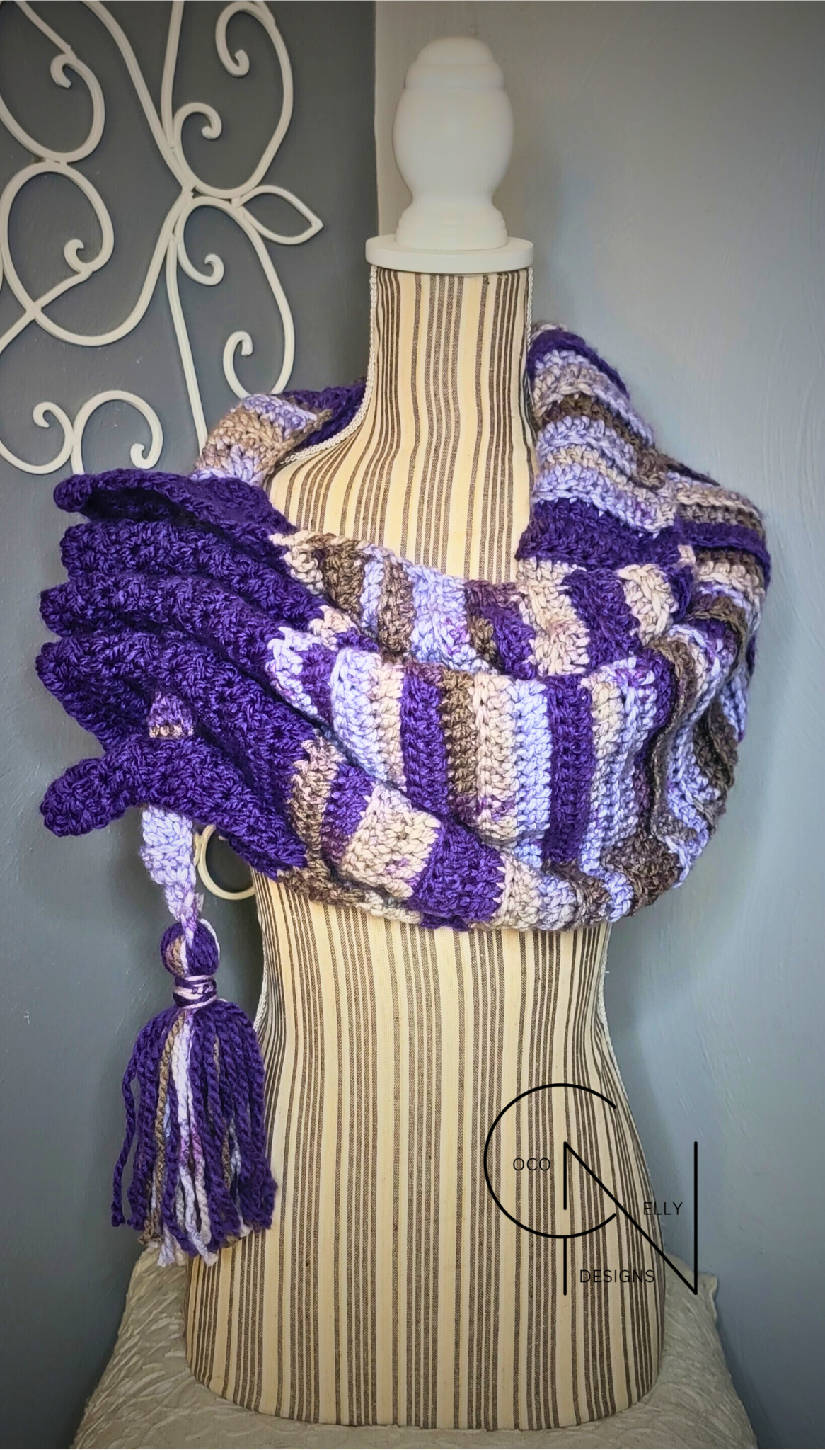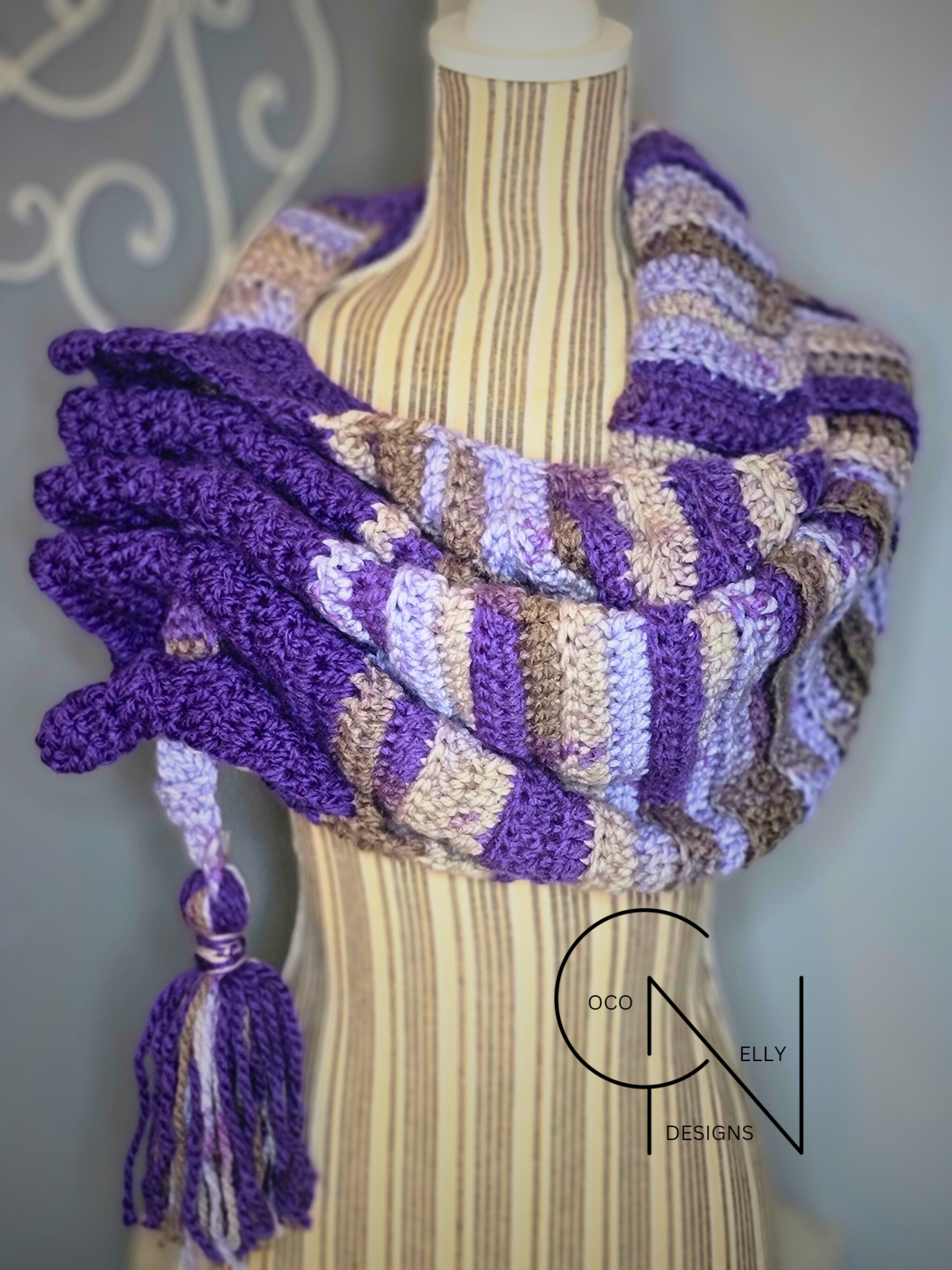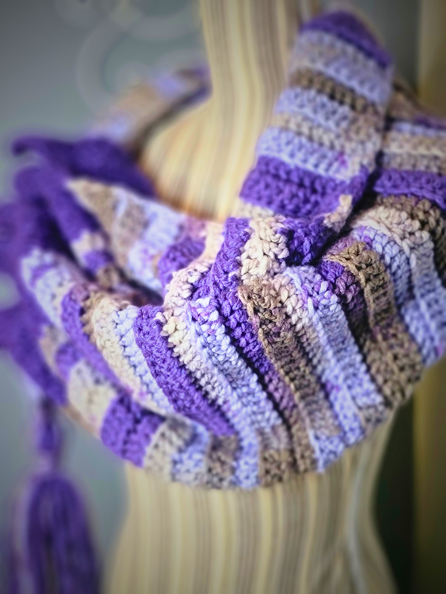 The Purple Passion Keyhole Scarf is an outstanding addition to any winter wardrobe. Crafted with one-of-a-kind acrylic yarn and a unique dye pattern, this scarf is sure to inspire a sense of exclusivity. It's crocheted design provides an extra level of insulation, keeping you snug and cozy in cold weather. Add a tasteful touch of luxury with this soft, tassled, keyhole scarf.