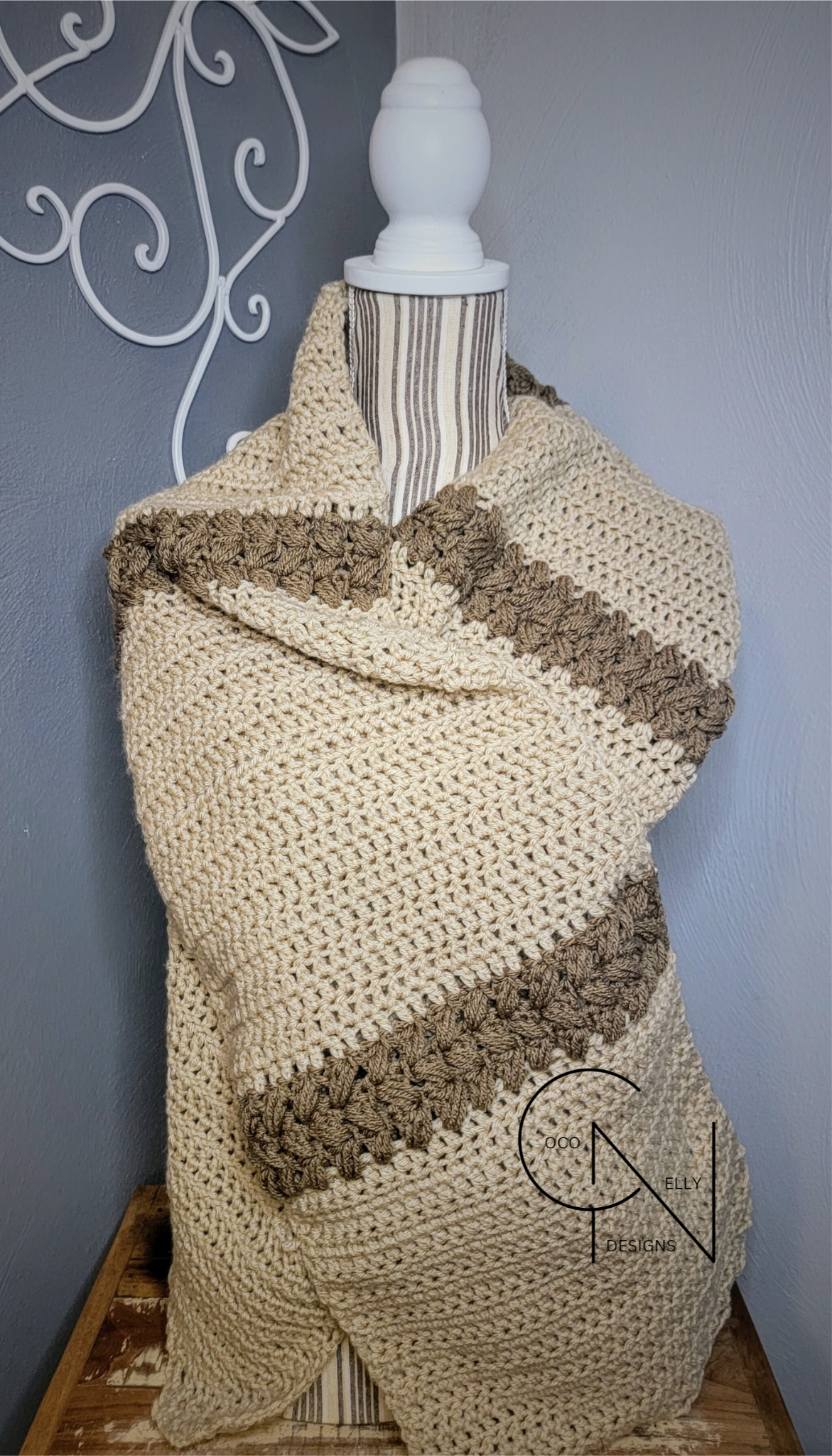 This one-of-a-kind handmade wrap is the perfect winter accessory. Crafted with thick and soft crochet fabric, it provides warmth without sacrificing style. The tan and brown stripes create a beautiful contrast and the wrap length ensures a snug fit. So look no further - this wrap is both comfortable and stylish.