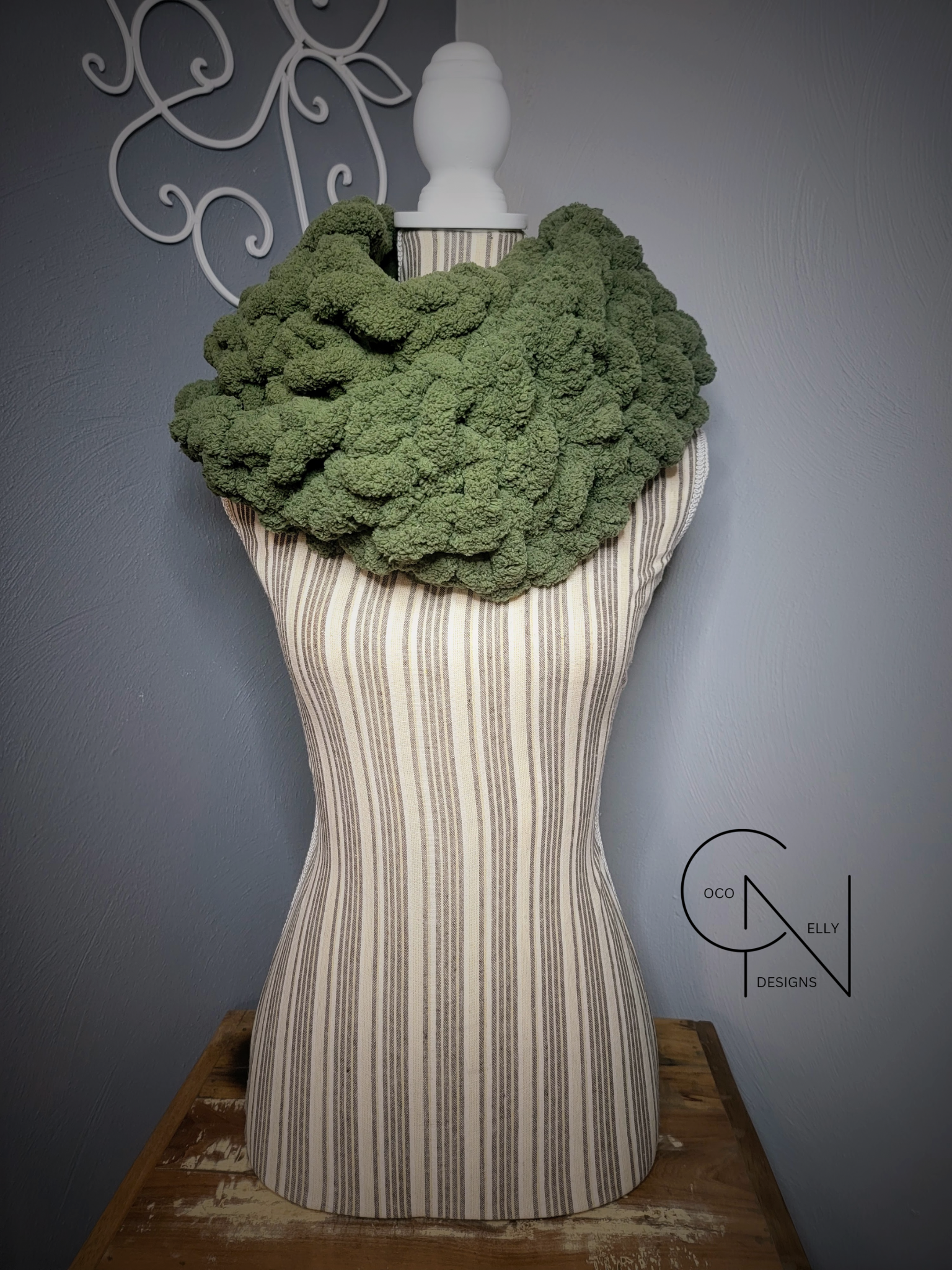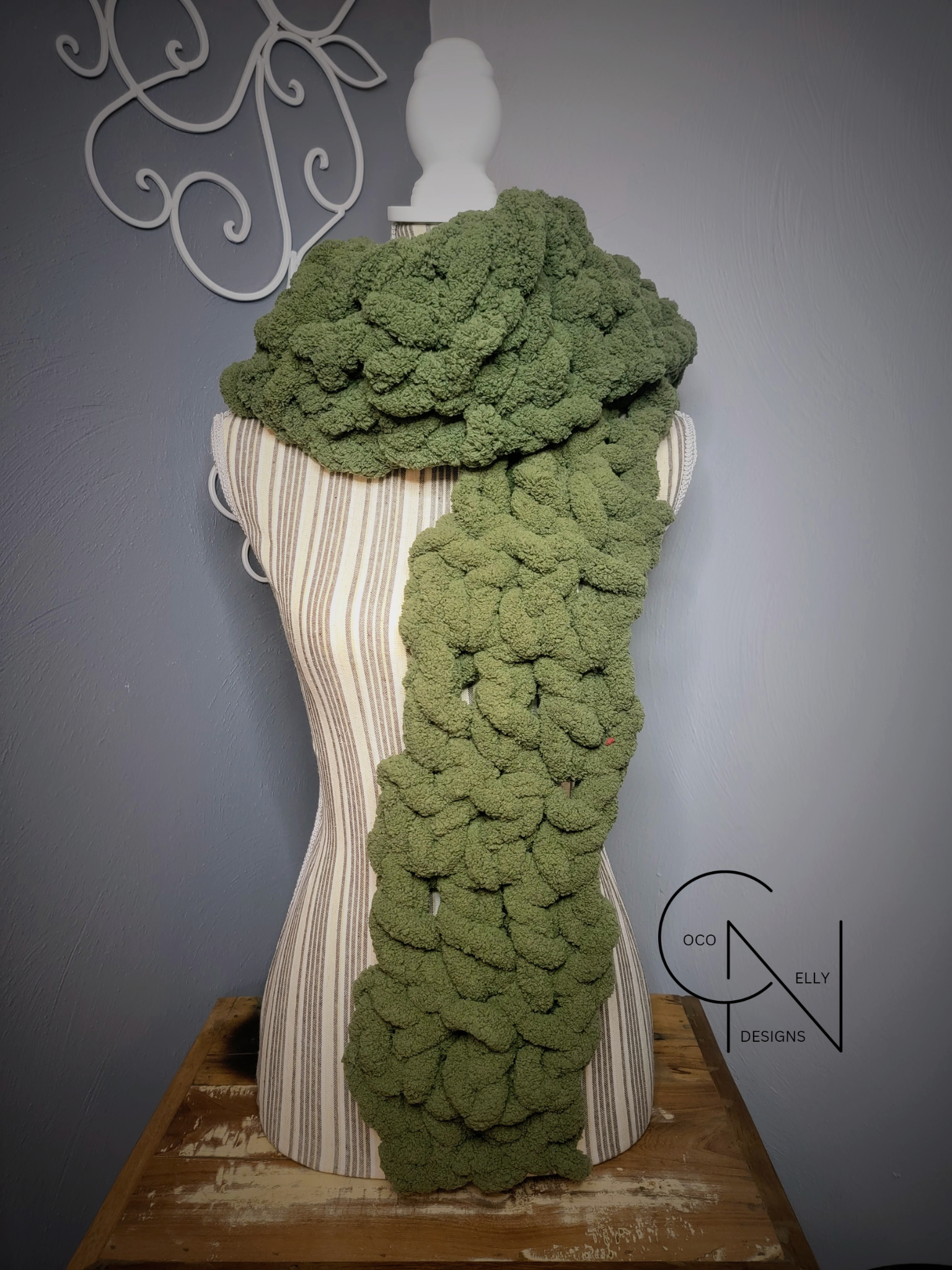 This luxurious and warm Super Chunky Olive Green Scarf is perfect for winter. Adorned with hand-made crochet detail and made using a thick, soft material, this scarf is sure to keep you cozy and protected against the cold.