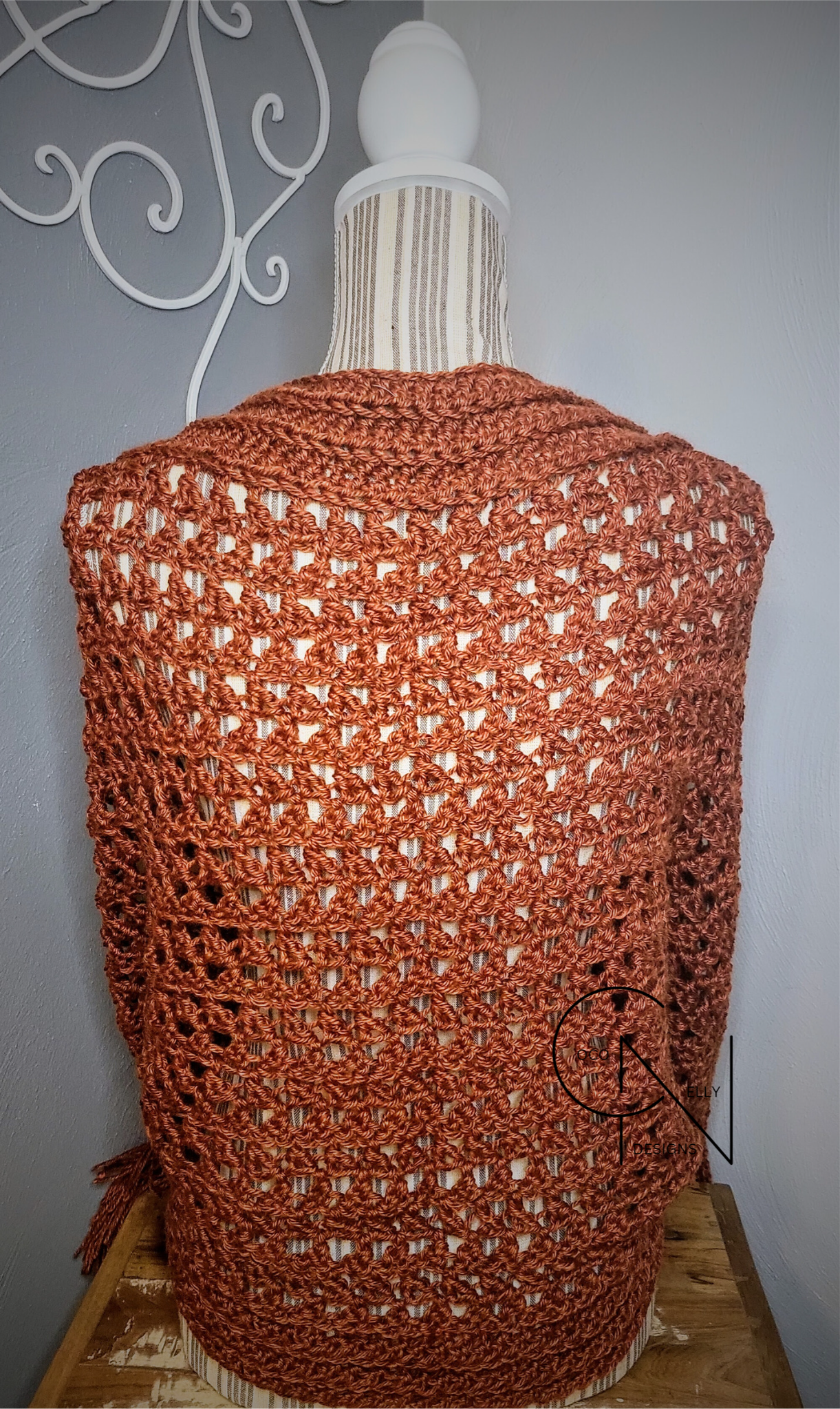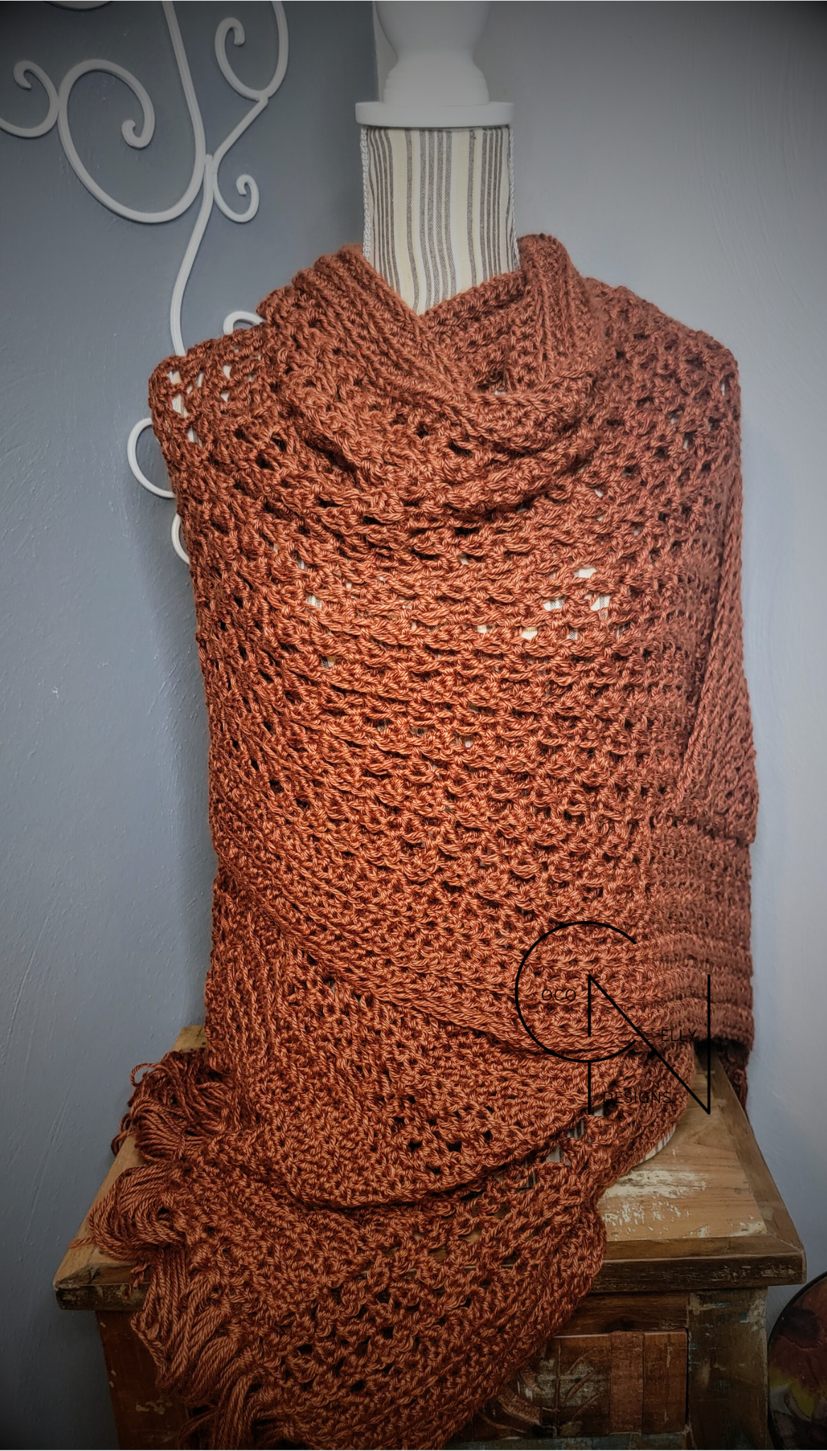 This opulent, hand-made terra-cotta wrap is crafted with airy, soft crochet for a one-of-kind feel. Perfect for winter, fall, or even spring time, it will keep you cozy and warm with its very stretchy fibers and oversized shape. Finishing touches like pockets make this beautiful wrap a luxurious statement piece.